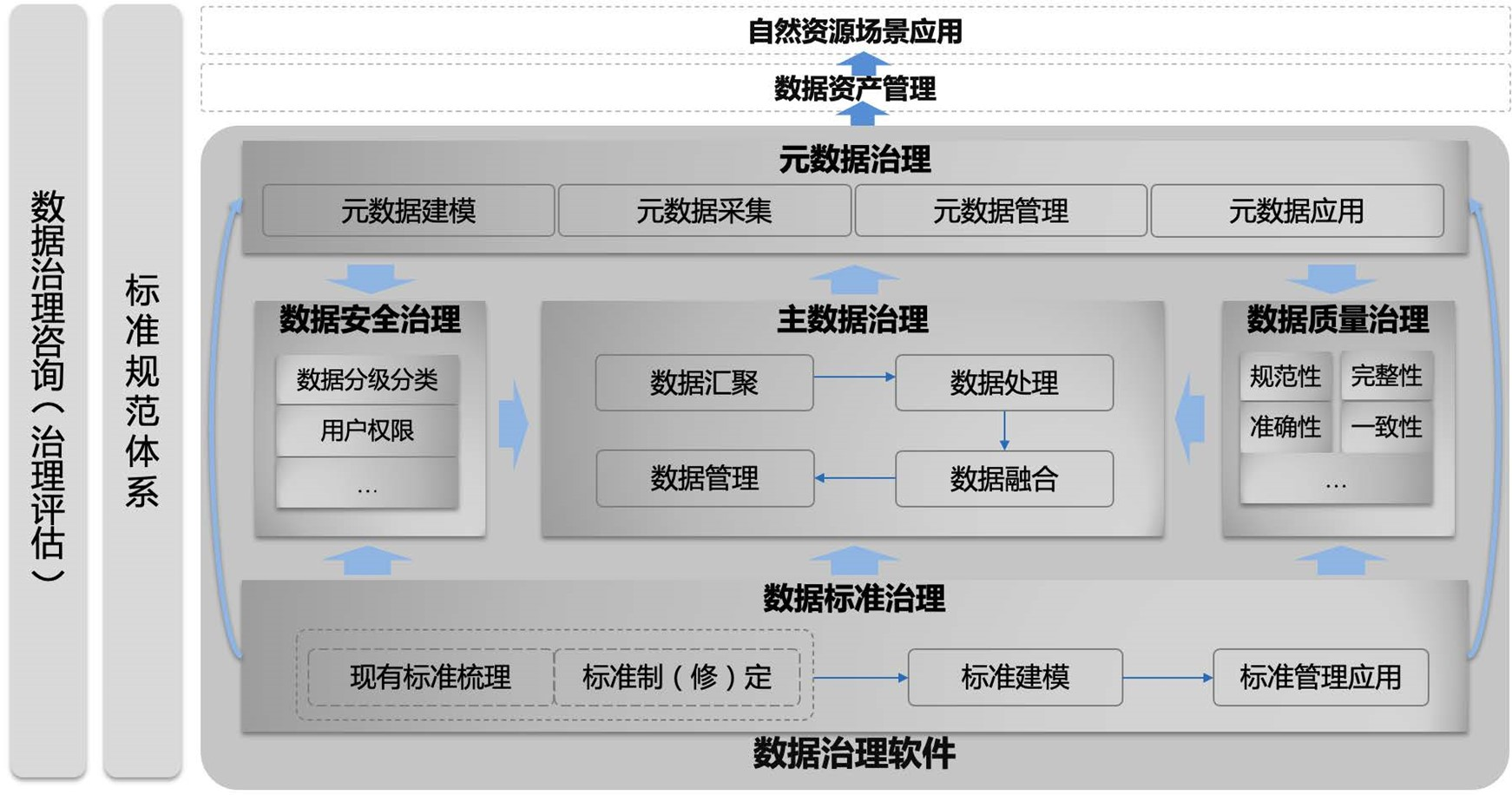 自然资源数据治理总体架构以数据管理咨询和数据治理工程两项服务为基础, 以自然资源数据治理工具软件集为支撑, 面向以TIM 为导向的自然资源数据汇聚、治理与融合,提供数据标准治理、数据质量治理、元数据和主数据治理、数据安全治理等服务,帮助用户构建形成权威、统一的自然资源数据资产,支撑自然资源各业务场景的应用。